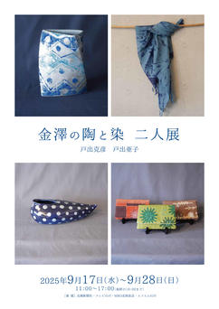 金澤九谷の伝統を踏まえつつ新しい銀箔の世界「釉面銀彩®」の技を研く戸出克彦。加賀友禅から染の道をスタートした亜子。金沢で生まれ育った二人が、それぞれの技法から生み出す陶と染の作品をお楽しみください。味わい深い「釉面銀彩®」の花生。ペルシャ釉や黒泥、青磁など遊び心ある器。友禅、型染でのタペストリーやストール等、現代の生活に合う作品を約100点展示致します。